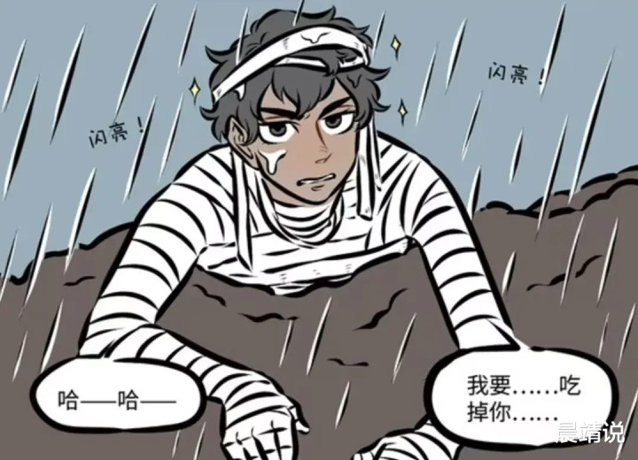 很快,阿布在大雨中,从土堆底下爬了上来。由于为了制造恐怖的氛围,阿布提前解开了脸上的绷带。敬业的阿布嘴巴里还发出了嘶吼声,合作着导演预留给他的台词,我要把你吃掉......