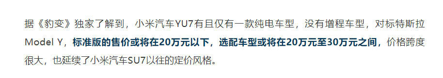 据爆料,小米汽车YU7有且仅有一款纯电车型,莫得增程车型,对标特斯拉Model Y,圭臬版的售价或将在20万元以下,选配车型或将在20万元至30万元之间,价钱跨度很大,也不竭了小米汽车SU7以往的订价立场。