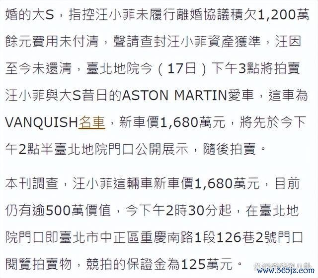 讼事掀开于今遥远没能达成息争,大 S 指控汪小菲拖欠 1200 万台币的生计费,苦求查封汪小菲的财富,因男方莫得还清,法院才决定拍卖其豪车。