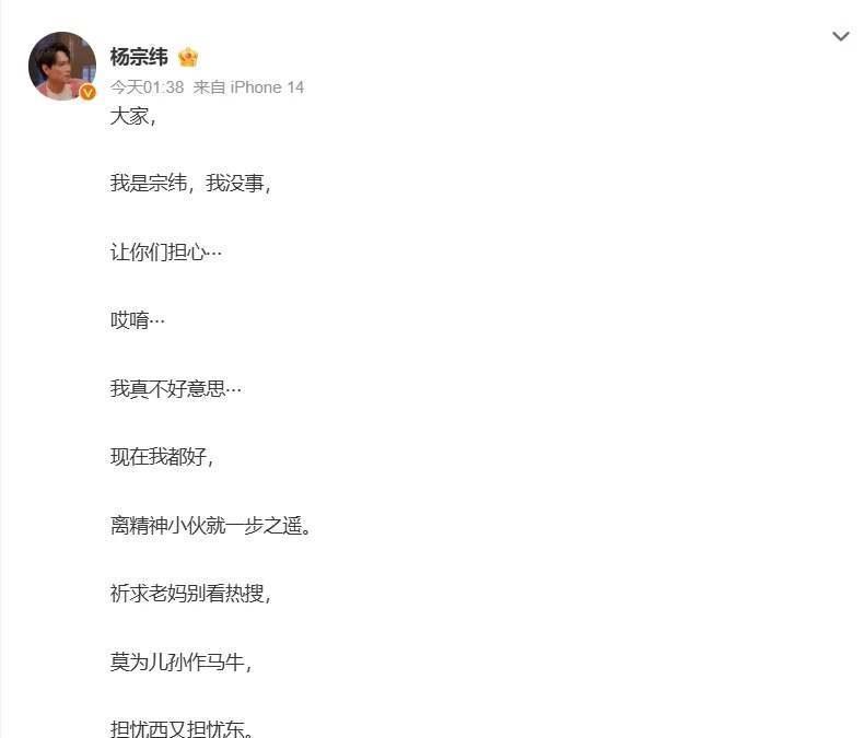 杨宗纬次日凌晨在酬酢平台发布讯息,称我方体魄无大碍,并感谢西宁不雅众和职责主说念主员。他尽头提到母亲不要看热搜,还反复强调“当今我王人好”。现场不雅众拍摄的视频败露,杨宗纬倒地时正唱到“让我随你去”,歌声蓦地中断,随后侧身摔出舞台边际。演唱会因此中断,附近方通过官方账号向不雅众说念歉,愉快后续进展会实时通报。