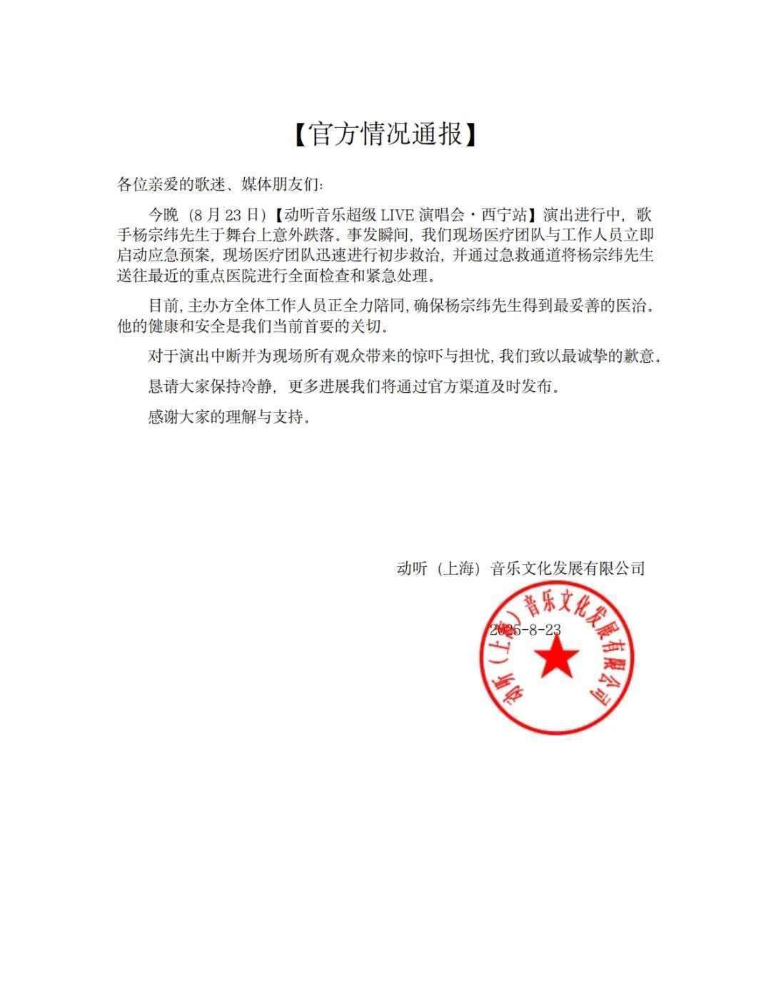 入耳音乐文化公司发扬本次上演,其宣传材料败露舞台策动耗时三个月。医疗团队在事发后三分钟内抵达现场,用担架将伤者抬出。救护车未鸣笛警示,以幸免惊吓其他不雅众。病院搜检成果败露杨宗纬有隐微擦伤和腰椎损害,需静养不雅察。