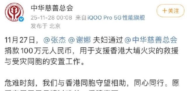 内容为张杰、谢娜老婆捐钱100万东谈主民币,用于香港受灾本家的安置责任。