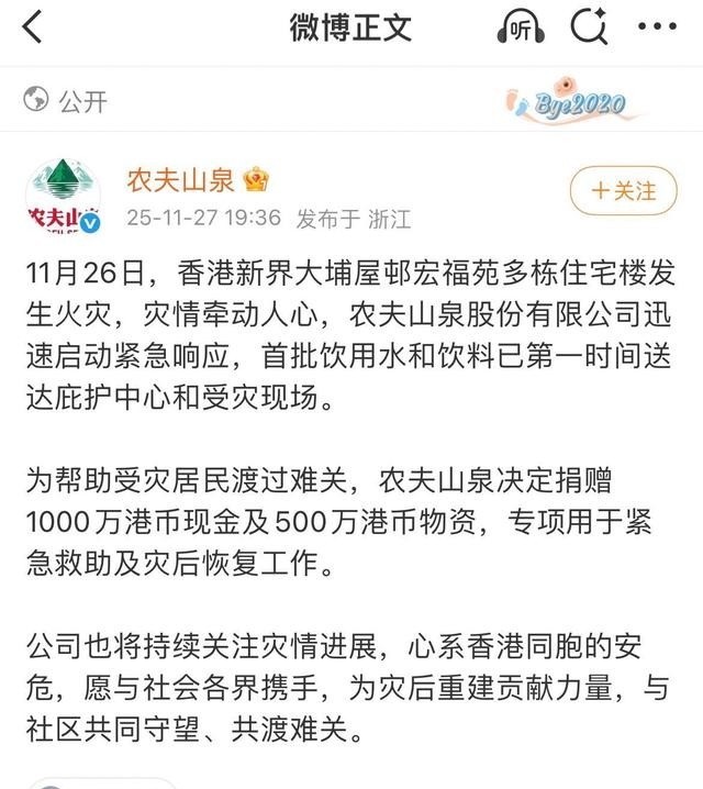 农夫山泉捐赠了1000万港币现款,及价值500万的物质;