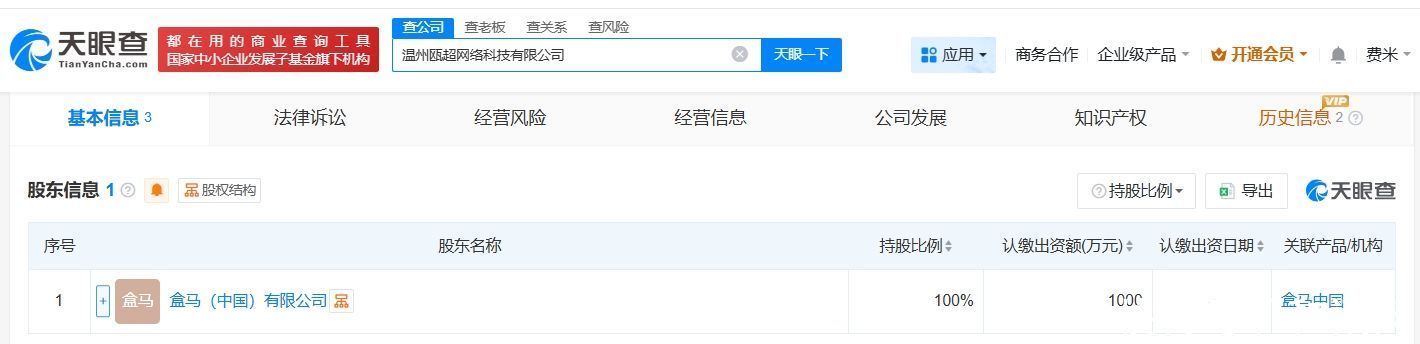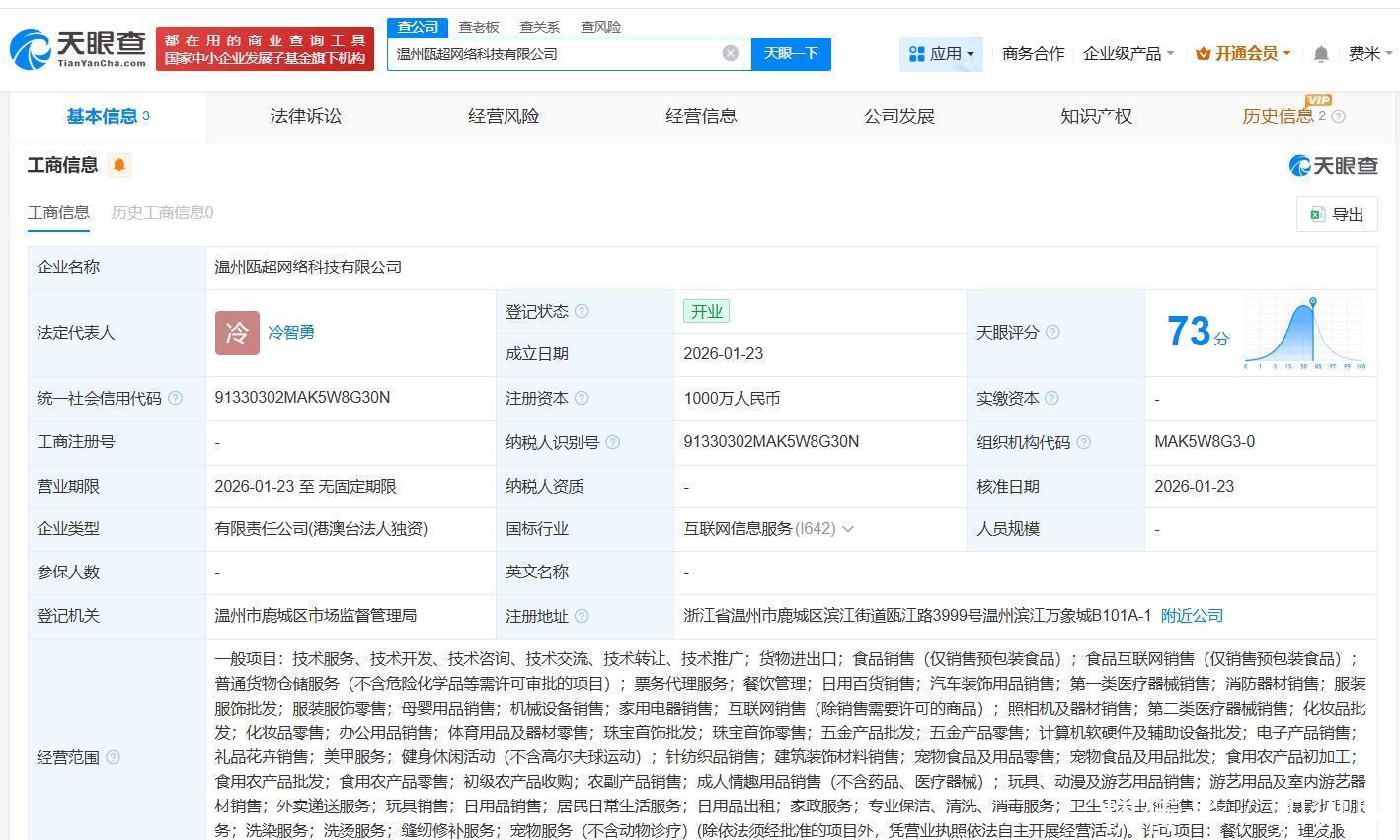 天眼查App显现,近日开yun体育网,温州瓯超采集科技有限公司树立,法定代表东谈主为冷智勇,注册老本1000万东谈主民币,计较规模包括货品收支口、食物销售、食物互联网销售等,由盒马(中国)有限公司全资握股。