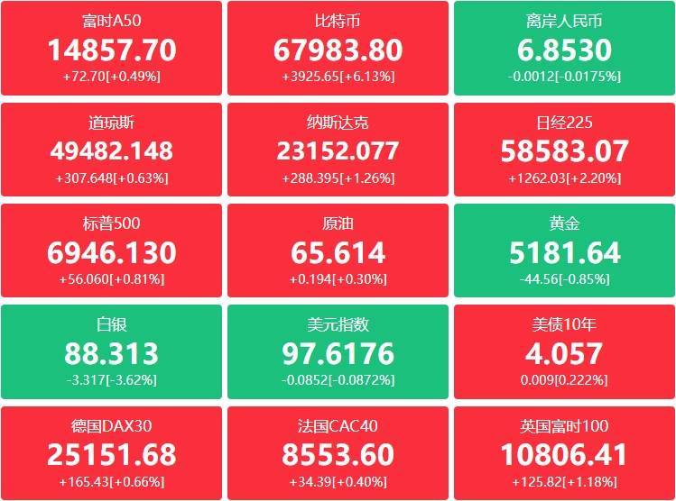 5、好意思股三大指数集体收涨,纳指涨1.26%,标普500指数涨0.81%,说念指涨0.63%。大型科技股全线上升,奈飞涨约6%,微软、Meta涨超2%,英伟达、英特尔、特斯拉、亚马逊涨超1%,加密货币见地股普涨,Circle涨超35%,Coinbase涨超13%,BMNR涨超10%,Strategy涨超8%,Robinhood涨超5%。CME集团收跌3.7%创昨年5月份以来最大单日跌幅;利弗莫尔中概股龙头指数收跌0.28%。万物重生涨超8%,涂鸦智能、富途控股等涨逾5%,进取融科涨超3%,贝壳、亚朵集团等涨超2%;AHG跌10%,玉柴国外跌超9%,新东方、阿特斯太阳能跌超5%,百济神州、NEGG跌超4%,联电、汽车之家跌超3%;国外贵金属期货巨额收涨,黄金期货涨0.14%报5183.70好意思元,白银期货涨1.95%报89.21好意思元;好意思油跌0.09%报65.57好意思元;布油涨0.45%报70.9好意思元。