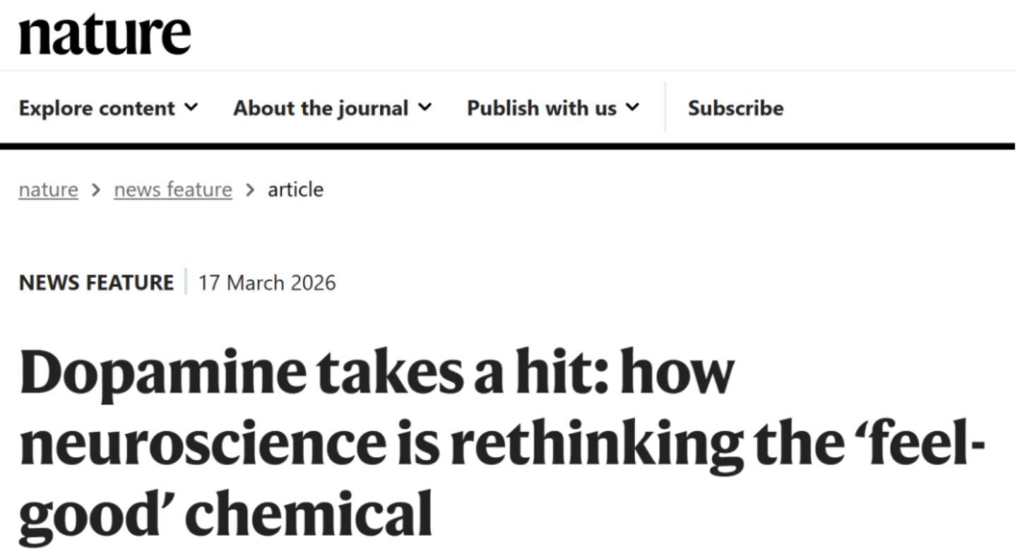 2026年3月17日,外洋顶刊《Nature》杂志发表了一篇炸药味完全的新闻专题,标题直指神经科学的中枢争议:《Dopamine takes a hit: how neuroscience is rethinking the ‘feel-good’ chemical》(多巴胺遇挫:神经科学若何重新凝视这种“忻悦化学物资”)。著作的导火索,是2025年5月西班牙塞维利亚多巴胺学会年会的一场要道狡辩。争论的焦点,是一个统治鸿沟数十年的经典假说——犒赏预计差错(RPE)表面。大宗新接头正在动摇它的根基,致使有东说念主以为,它可能被透澈推翻。