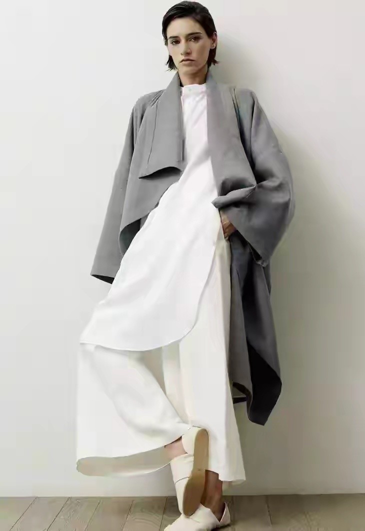 固然啦,大衣外衣亦然能穿出个性风,举例底下这件灰色的大衣内搭一件长款的衬衫,加上一条白色的阔腿裤,脚上穿了一对平底的单鞋,这么的穿衣打扮就很个性,但不符合闲居穿搭。