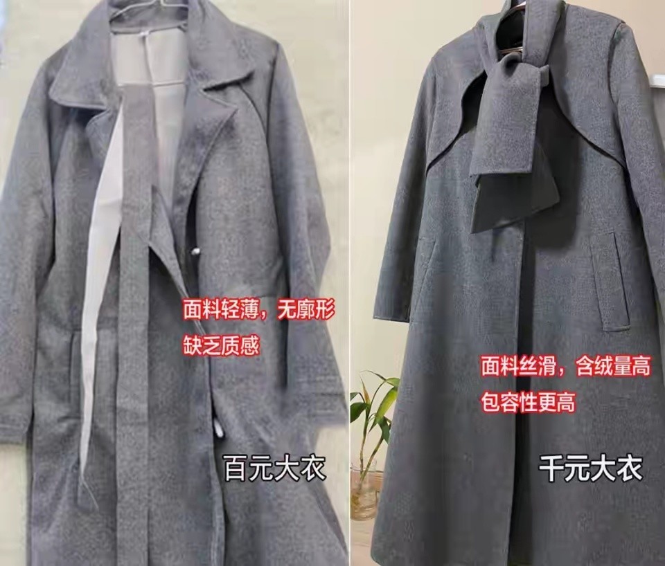 我们来看一下百元大衣外衣,面料浮薄,无廓形,短缺质感,起褶皱,可能穿的没几天就会容易起毛起球了。